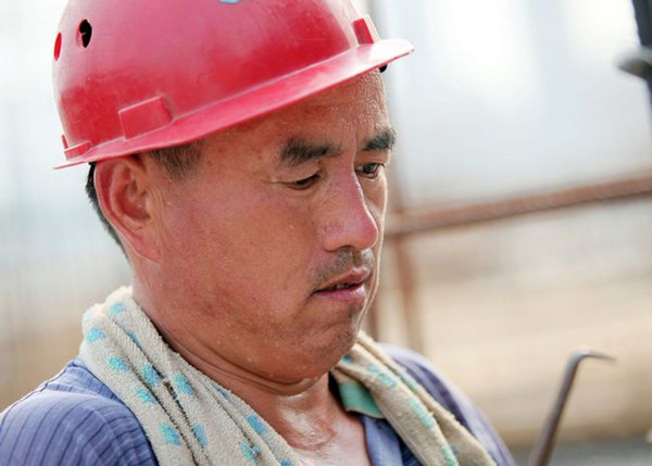 采訪時(shí)正值下午三點(diǎn)半,室外溫度達(dá)到35℃,再加上地面被太陽(yáng)炙烤了幾個(gè)小時(shí),直逼上來的熱氣讓人有點(diǎn)吃不消。筆者在工地的陰涼處呆了不到5分鐘,從頭到腳已出了不少汗。市房管局中遠(yuǎn)公司涵翠苑項(xiàng)目部技術(shù)員陳生文告訴筆者,“項(xiàng)目部為工人們制訂了防暑降溫的辦法,充足供應(yīng)綠豆水,正午太陽(yáng)很毒的時(shí)候休息會(huì),下涼后再干。”陳生文說完,接個(gè)工友的電話就又忙著干活去了。
