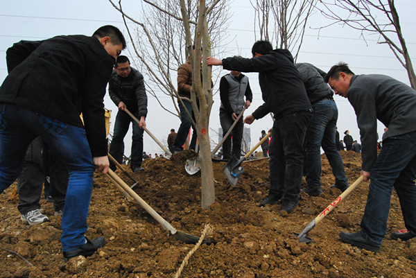 又到了一年植樹時節(jié),為積極響應(yīng)市委、市政府關(guān)于“創(chuàng)建全國綠化模范市”的工作目標(biāo),加快生態(tài)環(huán)境和宜居城市建設(shè)步伐,3月12日,公司職工們在書記杜洋堅的帶領(lǐng)下,參加了住建局組織的義務(wù)植樹活動。 在北辛植物園現(xiàn)場,彩旗飄揚(yáng),人聲鼎沸,現(xiàn)場呈現(xiàn)一派熱火朝天的勞動景象。剛到現(xiàn)場,筆者就看到職工三五人一組分頭干了起來,“一、二、三起”抬樹的男同志們喊著號子一齊發(fā)力,將土球直徑足有70公分的白玉蘭樹逐一抬進(jìn)樹坑,“刺啦一聲”有的同志竟因用力過猛將衣服撕出了一道長口,雖如此,他們依然干勁十足,將每棵樹“安排到位”。樹一進(jìn)坑,女同志們就開始往坑內(nèi)填土,并將土踩實,完成之后再澆上定根水,確保所栽樹木的成活率。合理分工、齊心協(xié)力,不到2小時,現(xiàn)場區(qū)域內(nèi)的玉蘭、垂柳等樹就被栽種完畢。
