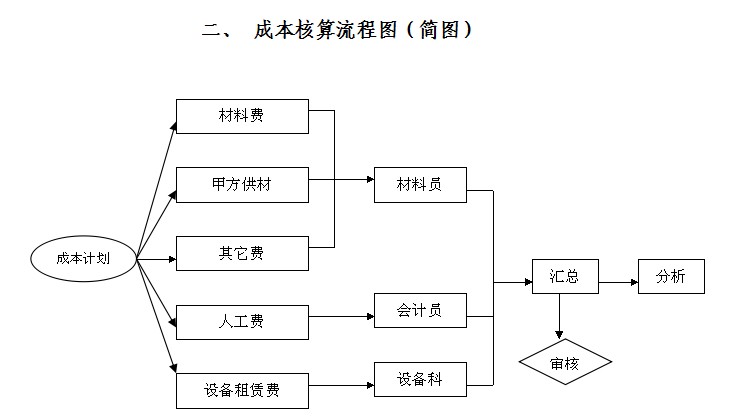一、成本核算程序 1、各項(xiàng)目部材料員及時(shí)提供原始資料。 2、根據(jù)原始憑證按照費(fèi)用支出計(jì)劃,計(jì)算、編制各類匯總表。 3、根據(jù)各種費(fèi)用匯總表或原始憑證,及時(shí)登記有關(guān)明細(xì)分類,歸集有關(guān)成本項(xiàng)目。 4、工程竣工后及時(shí)進(jìn)行匯總,核算工程總成本。 二、成本費(fèi)用控制 1、各項(xiàng)目部材料員應(yīng)及時(shí)整理材料費(fèi)用支出的原始資料,匯總本月發(fā)生零星材料及其它費(fèi)用制作材料采購清單,報(bào)分管經(jīng)理總經(jīng)理批準(zhǔn)并于次3日前送核算部開據(jù)材料匯總單,辦理掛帳手續(xù)。 2、各項(xiàng)目部會(huì)計(jì)及時(shí)制作各類人員工資表,報(bào)分管經(jīng)理總經(jīng)理批準(zhǔn),并于次3日前送核算部,核算部根據(jù)完成的工程量結(jié)合承包合同開人工費(fèi)匯總表,辦理掛帳手續(xù)。 3、各項(xiàng)目部材料員應(yīng)及時(shí)對(duì)甲方供應(yīng)的材科對(duì)帳,對(duì)各類供材進(jìn)行匯總并于次3日前送核算部,核算部核對(duì)成本計(jì)劃,制作成本報(bào)表。 4、設(shè)備科月末匯總《設(shè)備租賃核算月報(bào)表》,報(bào)分管經(jīng)理總經(jīng)理簽字并于次月3日前將數(shù)據(jù)送核算部。 5、根據(jù)單據(jù)匯總核算各工程項(xiàng)目當(dāng)月發(fā)生額和余額,并與計(jì)劃對(duì)比,制作工程成本報(bào)表。 6、工程竣工后及時(shí)進(jìn)行匯總費(fèi)用報(bào)表,核算工程總成本。 7、核算部每月未同材料部、財(cái)務(wù)部、項(xiàng)目部材料員對(duì)倉庫進(jìn)行清查貨物,確保帳實(shí)相符制作財(cái)產(chǎn)清查表。