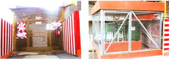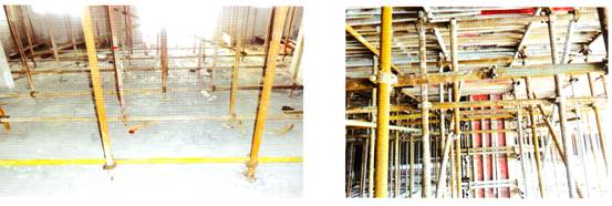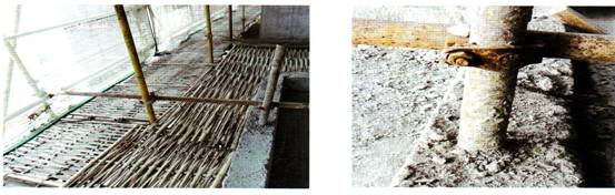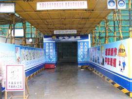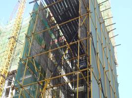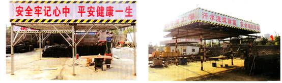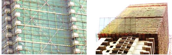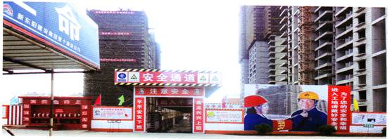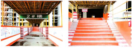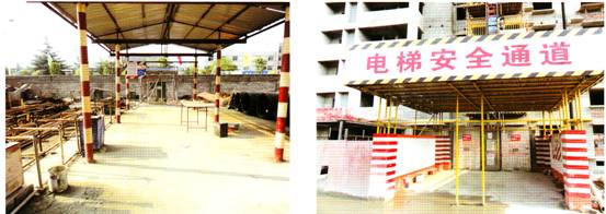 | 8、腳手架:外腳手架均采用扣件式鋼管腳手架,落地式腳手架的基礎(chǔ)應(yīng)堅實(shí)、平整,并澆搗泥土,外設(shè)排水溝。每根立桿底部應(yīng)設(shè)置墊板和底座,并應(yīng)設(shè)置縱、橫向掃地桿。懸挑架的懸挑梁(16#以上工字鋼制作)必須擱置在樓板、梁或墻體等建筑結(jié)構(gòu)部位上,不能設(shè)在懸挑板上,并設(shè)置兩道預(yù)埋圓鋼(直徑不小于16mm)U型環(huán)固定。挑出建筑物外寬度不得大于1.2m。底層應(yīng)滿鋪腳手板,并在腳手板下滿鋪一層密目網(wǎng)封嚴(yán),內(nèi)部采用木板封嚴(yán),懸挑支承結(jié)構(gòu)必須專門設(shè)計計算。腳手架應(yīng)沉全高和全長連續(xù)設(shè)置剪刀撐,并應(yīng)設(shè)置橫向斜撐,橫向斜撐由架底至架頂呈之字型連續(xù)布置,沿腳手架長度間隔6跨設(shè)置一道,鋼管顏色為黃色,操作層設(shè)18cm踢腳板,顏色為黃黑相間。    9、安全通道和防護(hù)棚:安全通道防護(hù)棚的寬度應(yīng)不小于1.5米,長度不應(yīng)小于防護(hù)高度的物體墜落半徑的規(guī)定。安全通道和操作棚防護(hù)材料均采用φ48×(2.7~3.6)mm黃色鋼管搭設(shè),頂部應(yīng)能防砸、防穿透的雙層防護(hù),防護(hù)棚應(yīng)使用50mm的厚木板或相當(dāng)于50mm厚木板強(qiáng)度的其他材料。防護(hù)棚周邊應(yīng)上翻1000mm高,采用密目式安全網(wǎng)封閉,周邊掛設(shè)相關(guān)標(biāo)牌。通道兩側(cè)也采用密目網(wǎng)式安全網(wǎng)封閉,并掛設(shè)相關(guān)標(biāo)牌。鋼管顏色為黃色。              |