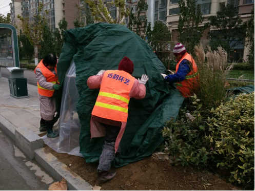此次苗木防寒工作,主要針對耐寒性較差及新栽植苗木,有針對性的采取搭風(fēng)障、纏麻繩、裹塑料薄膜、澆防凍水等措施,確保各類苗木安全過冬。重點(diǎn)對桂花、紅楓、玉蘭、烏桕、各種盆景等一些珍貴苗木進(jìn)行防寒。