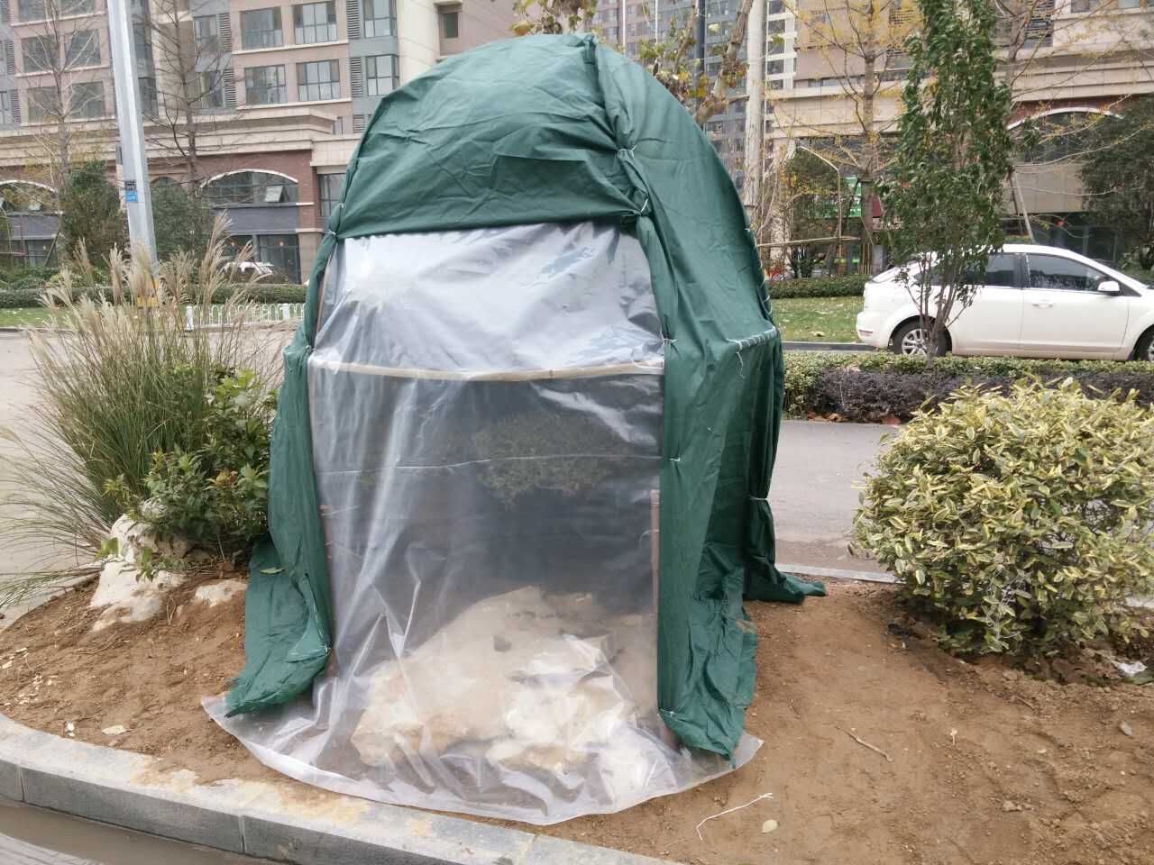 該項目部防風(fēng)障的搭設(shè)吸取了去年的經(jīng)驗,開現(xiàn)場會進(jìn)行研究并聽取相關(guān)專家的建議,去市民廣場的學(xué)習(xí),最后改進(jìn)了以往防風(fēng)障的搭設(shè)方法,在保證防風(fēng)障內(nèi)的采光、溫度、透氣性的前提下進(jìn)行了搭設(shè),對于大型的樹木進(jìn)行不封頂處理,一些小的盆景樁頭采用南面用透光性比較好的材料保證光照。毛娟、紅花檵木等小灌木用無紡布搭設(shè)防風(fēng)帶。養(yǎng)護(hù)的工作人員在做完防寒措施后,每天進(jìn)行排查,確保沒有任何安全隱患,確保防風(fēng)障的安全及保溫、防風(fēng)效果。目前此項工作基本收尾。 |